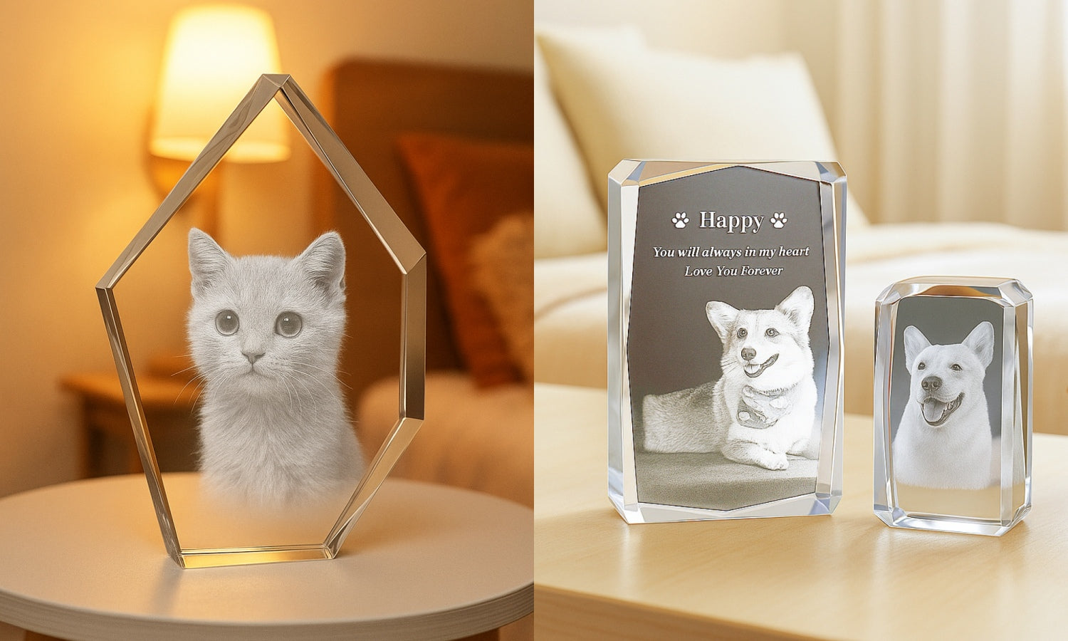 Crafted with advanced 3D laser engraving, this crystal art piece transforms your pet’s photo and personalized message into a stunning keepsake. A timeless way to honor the love you share.