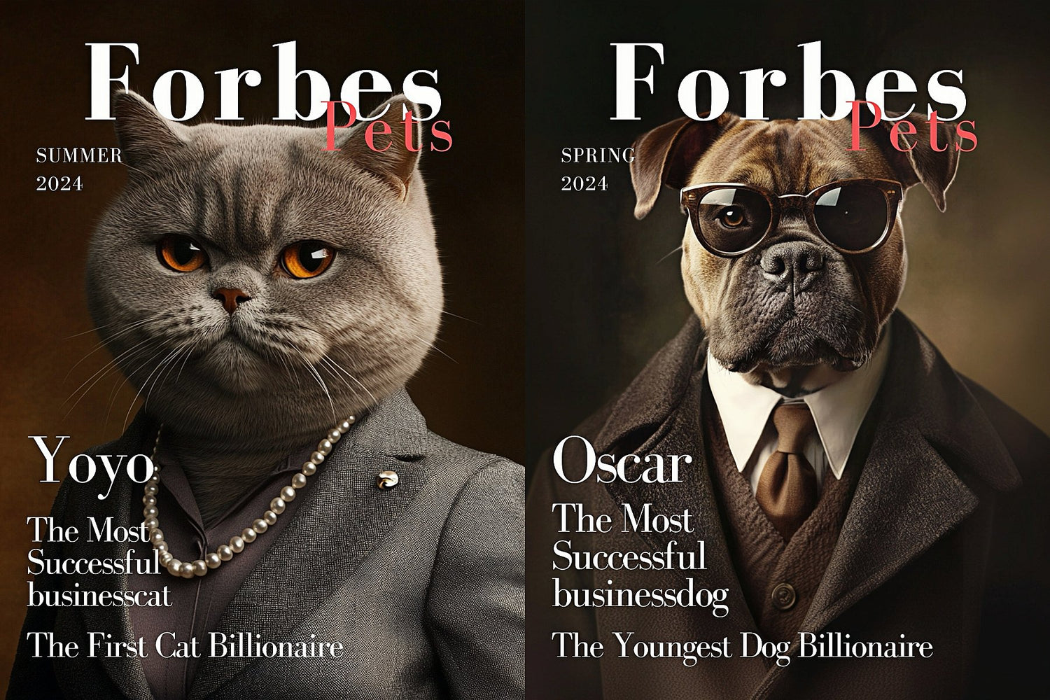 Turn your pet into a business star! Dressed in a sharp suit, your pet graces a magazine cover, exuding professionalism and charm. Perfect for showcasing your pet's executive flair.
