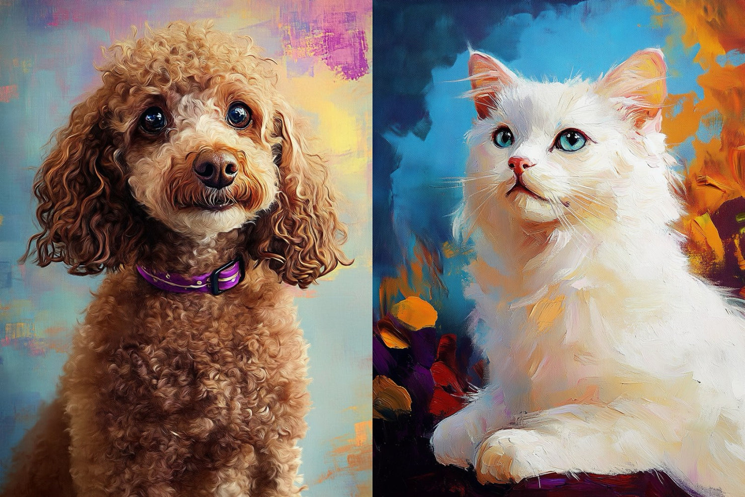 Capture your pet’s essence in vibrant oil painting style, with bold colors and lively strokes. Choose to print your pet portrait on canvas for a timeless, artistic display.