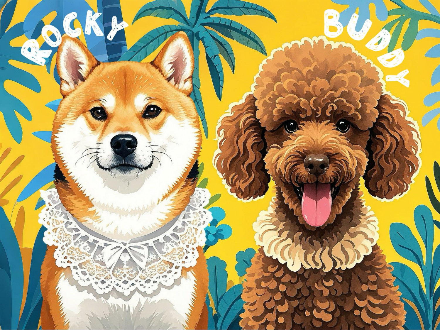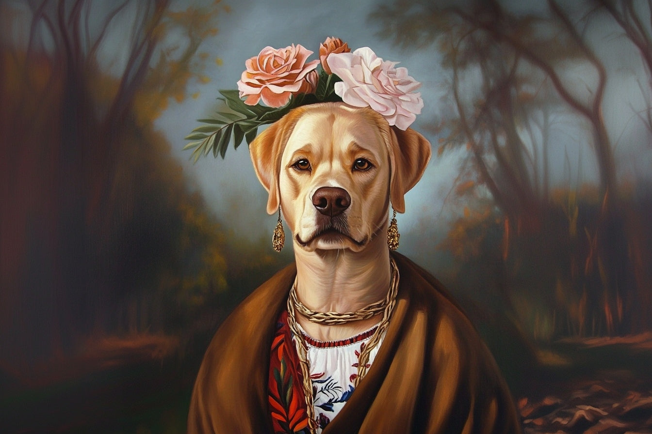 Bold and colorful, these Frida Kahlo-inspired pet portraits celebrate your pet’s vibrant personality. Perfect for showcasing their unique essence while honoring one of history’s most iconic artists.