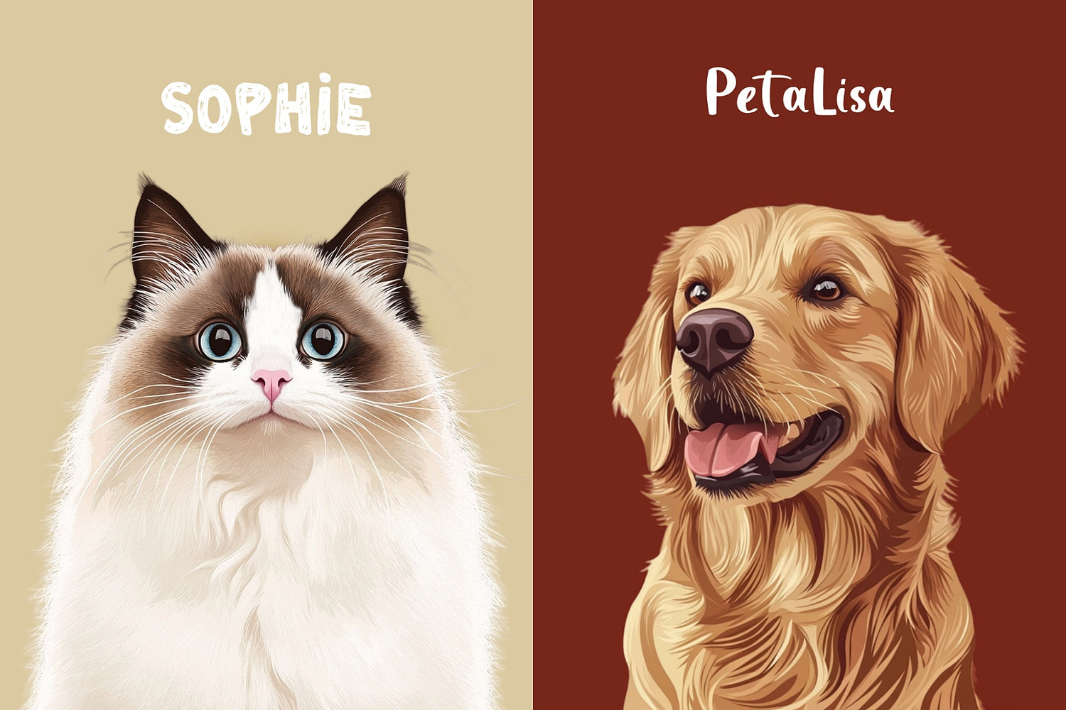 Brighten your space with minimalist pet portraits in vibrant colors. Featuring customizable fonts for your pet’s name, these designs add a fresh, modern touch to your decor.