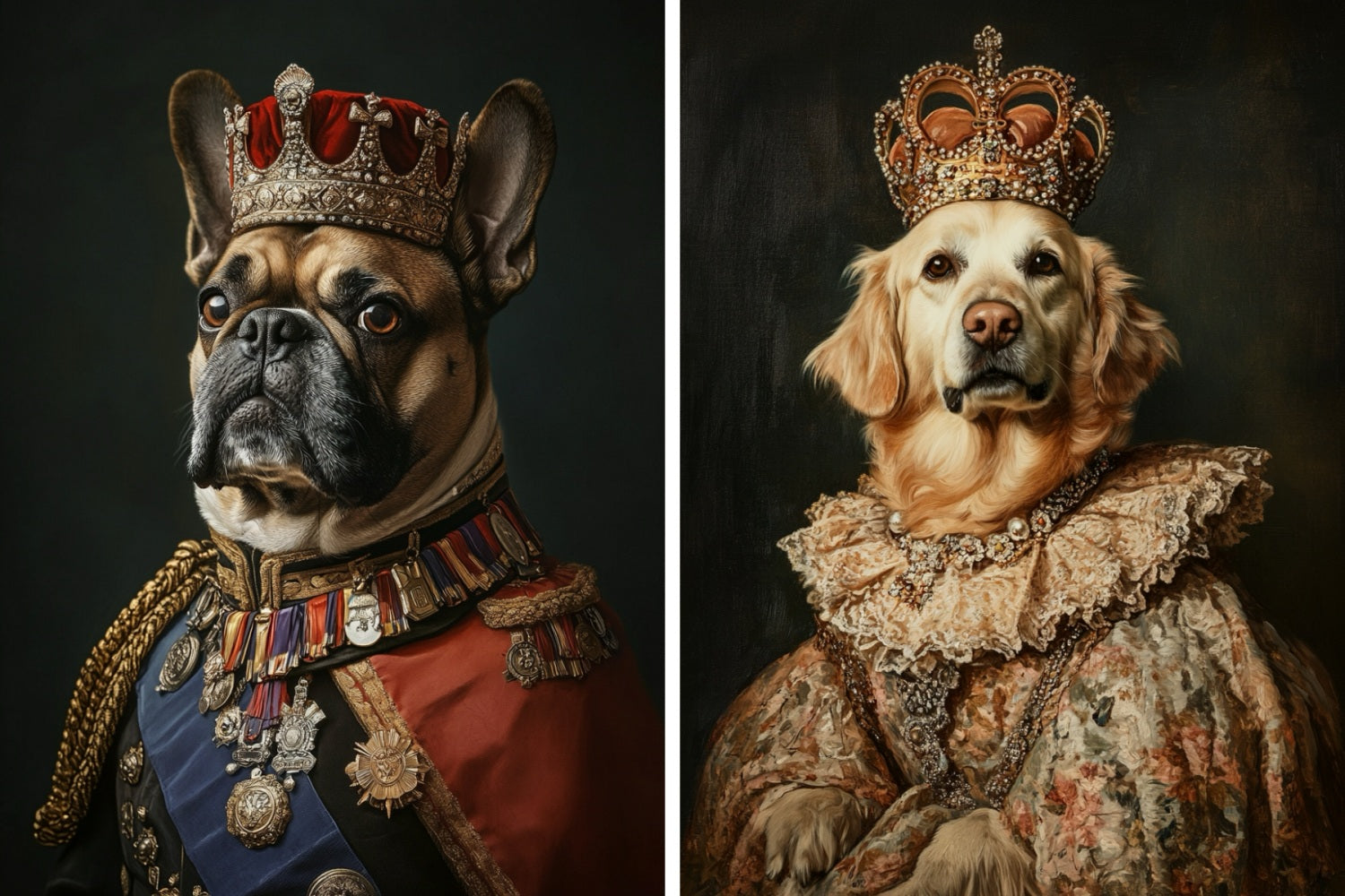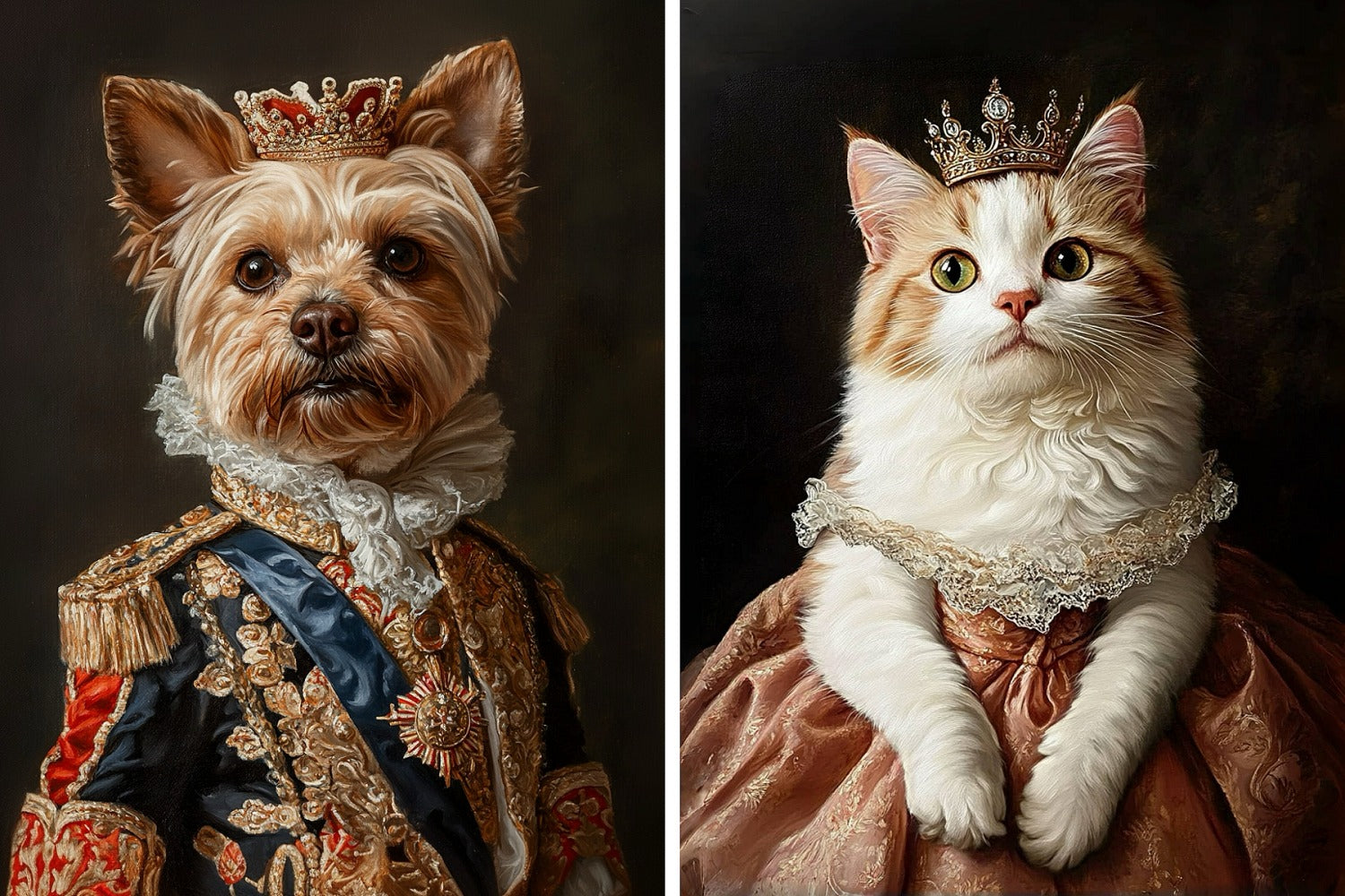 Your handsome prince radiates energy in stunning attire, while adorable princess dazzles in lovely dresses and delicate coronets. These royalty pet portraits perfectly capturing their lively personalities.