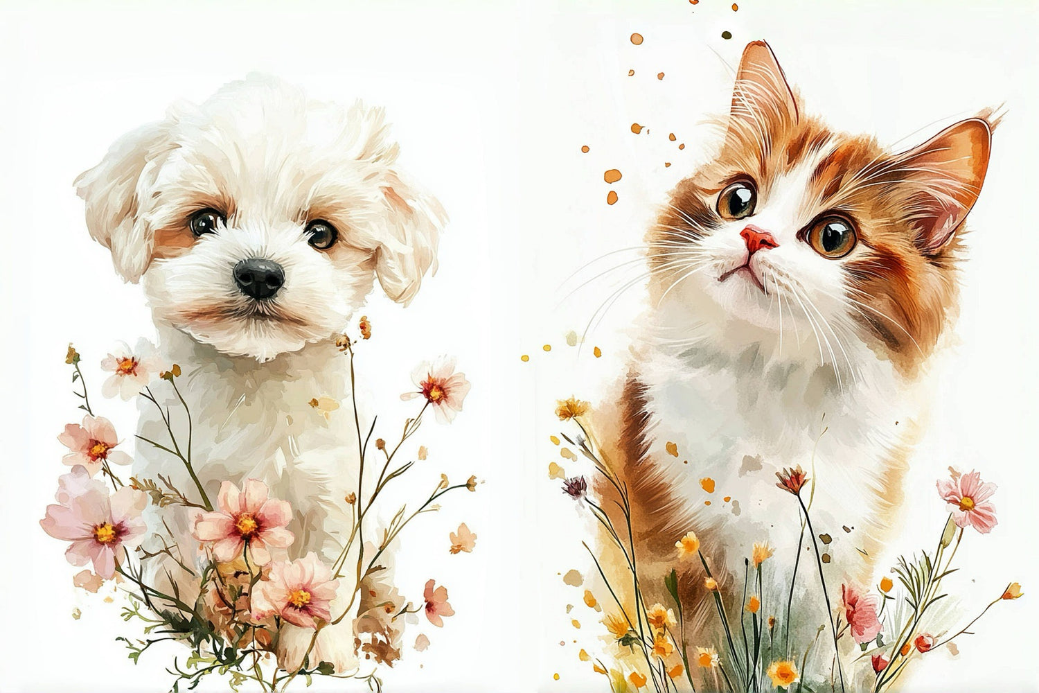 Capture your furry friend in the moment of a sunny afternoon, surrounded by a garden of tiny flowers. This watercolor pet portrait perfectly captures the essence of your pet's joyful playtime.